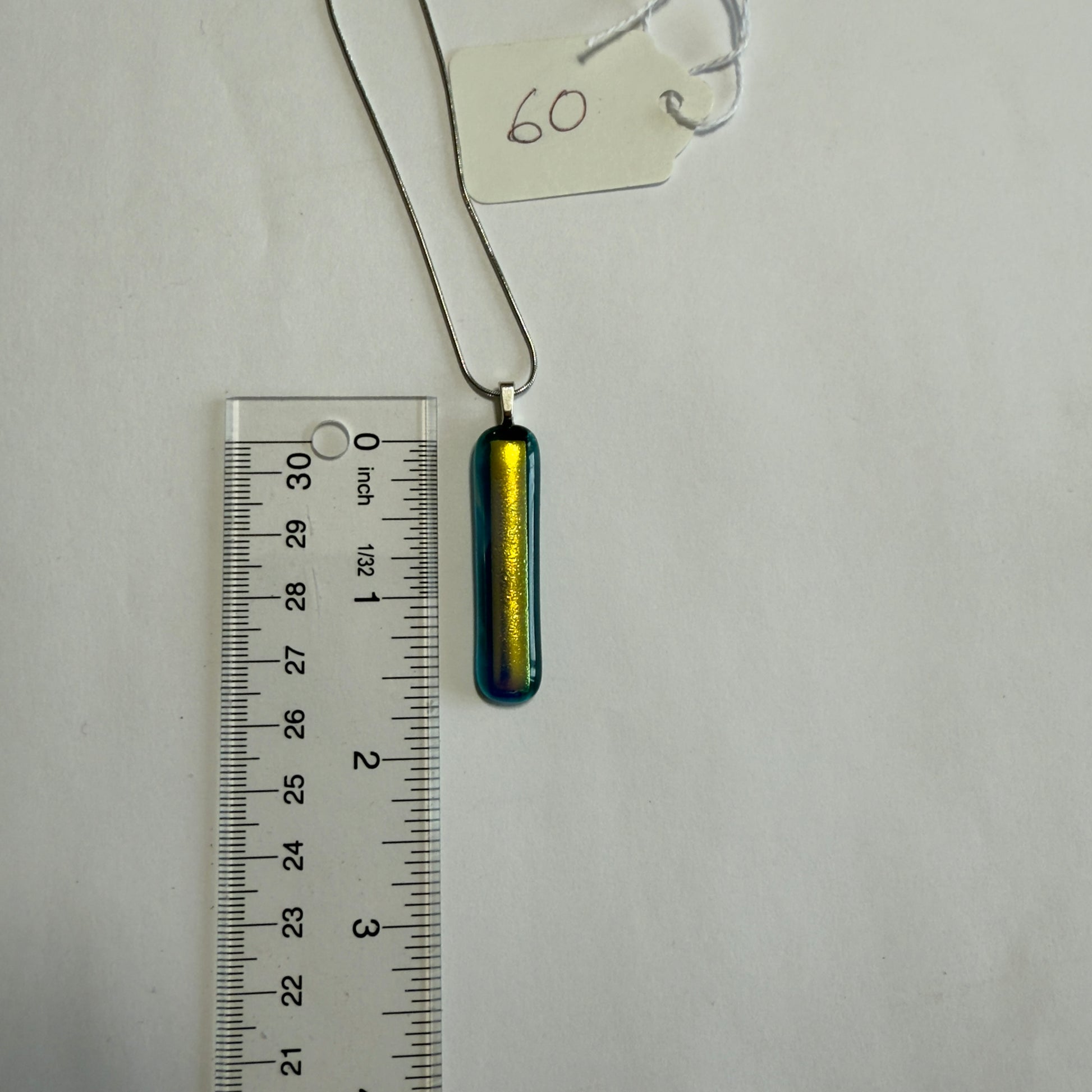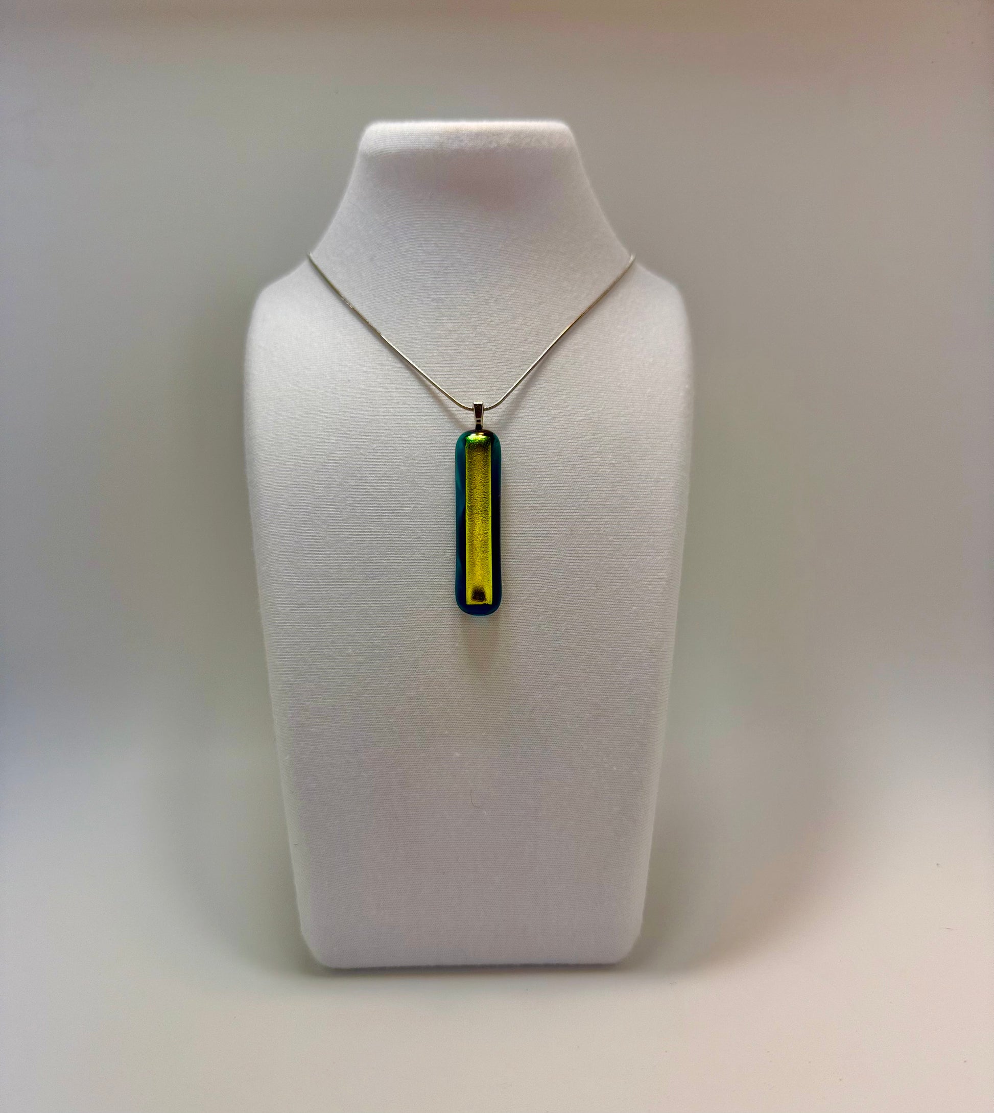 Gold Dichroic glass over Teal blue Antique glass pendant Size 4.0cm x 1cm with silver colored chain.