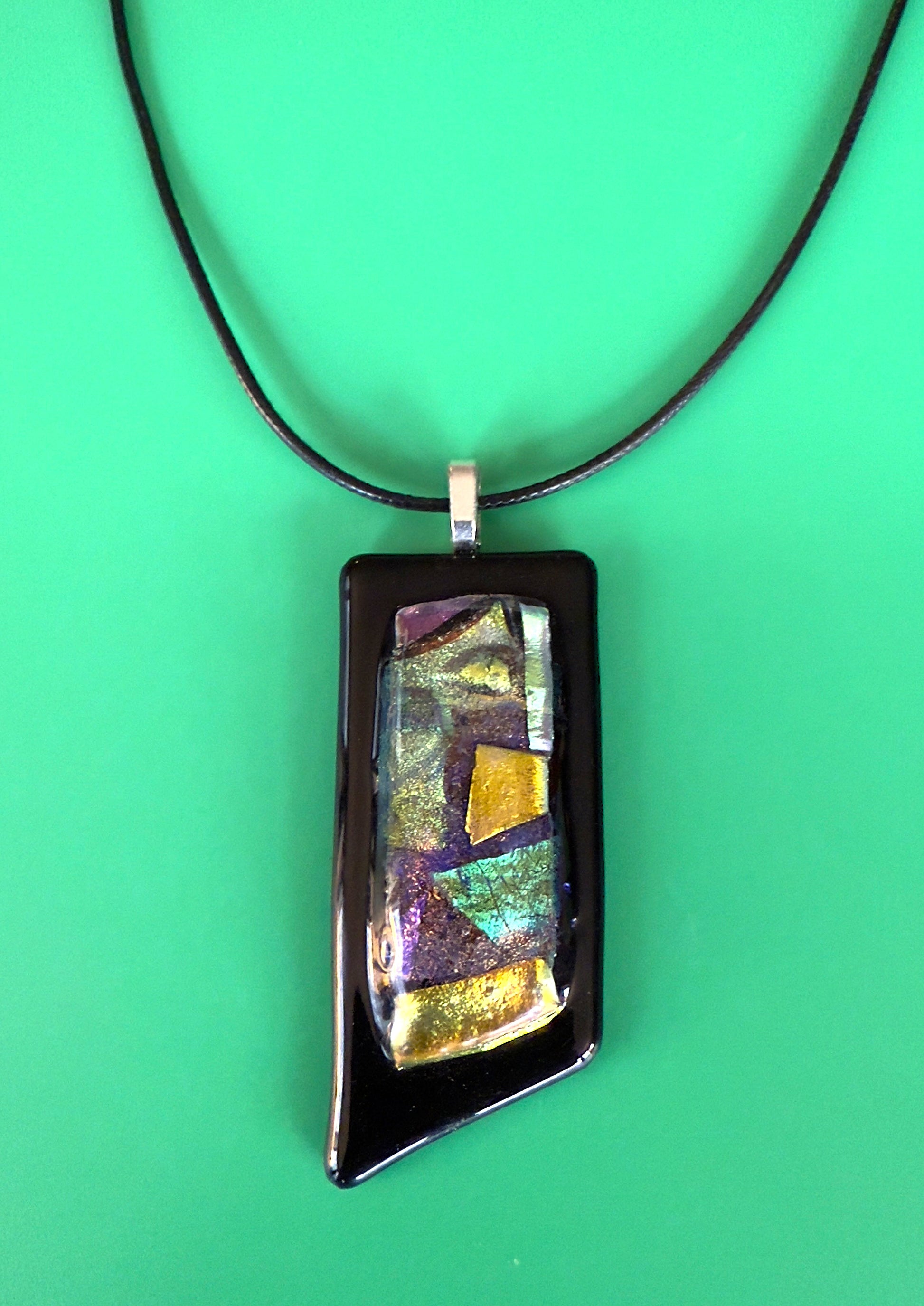 6.5cm x 3cm Clear Spectrum glass w/ dichroic glass chips over black Spectrum glass. This fused glass jewelry pendant is a radiant creation handcrafted by father and son artists Sam and Dennis Weddle in their Chelan Stained Glass studio in Wenatchee, Washington. Built upon a foundation of high-quality Spectrum sheet glass, each pendant features layers of luminous dichroic glass, fused with carefully selected frits and hand-placed elements that capture and reflect light in dazzling ways. During the kiln-firing process, the glass melts and flows together, creating organic textures, color gradients, and intricate patterns unique to every piece. The result is a pendant that feels alive with color and motion—changing hues as it moves in the light. Every pendant embodies both precision and artistry, combining time-honored glasswork with modern design sensibilities. No two are ever alike. Each one carries the creative spirit of collaboration, the legacy of fine craftsmanship, and the