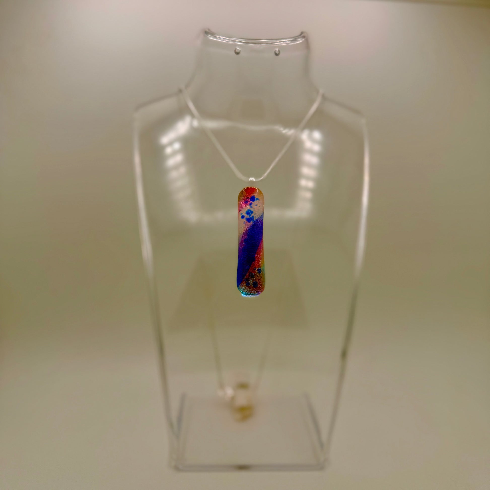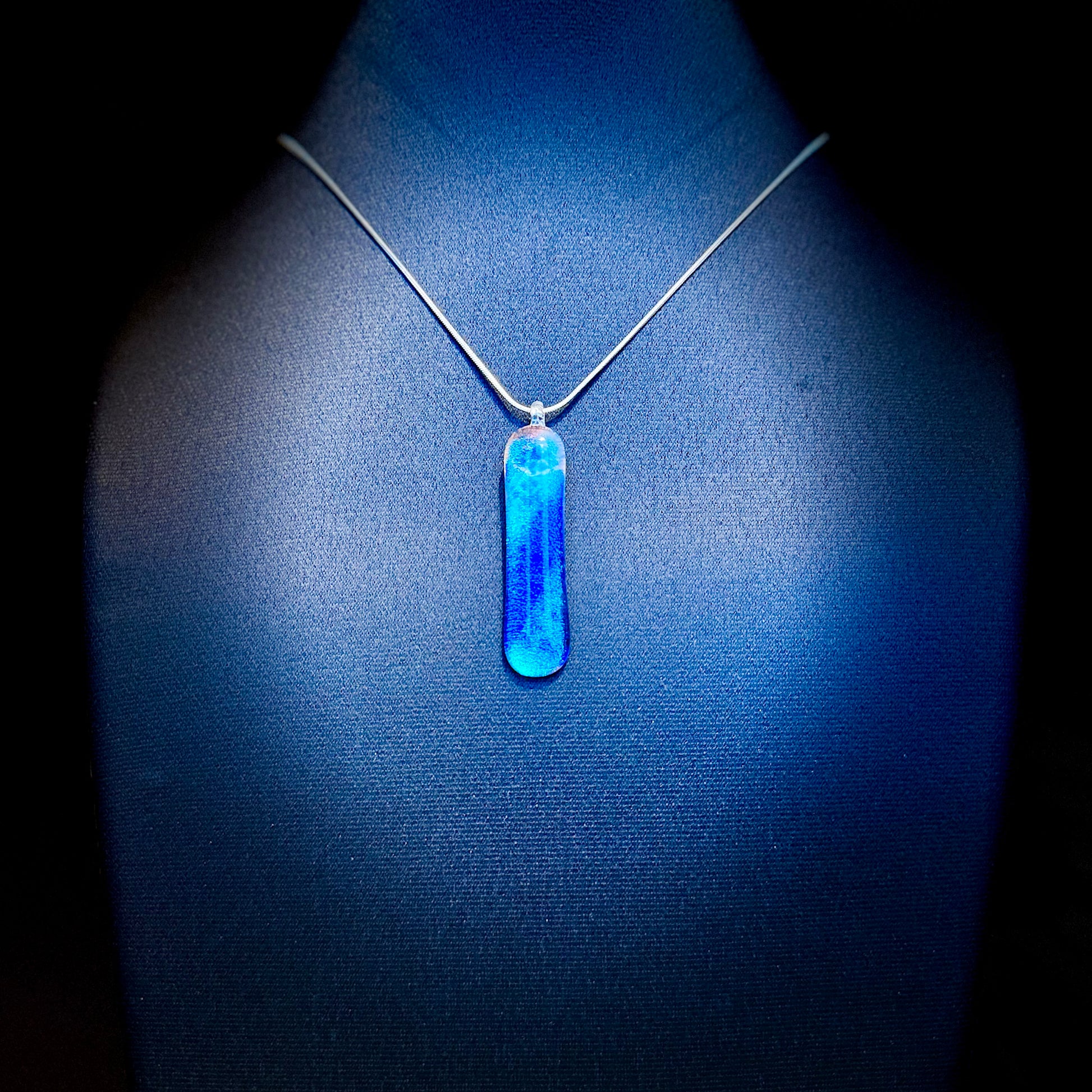 White, Clear, Blue and Pink Antique art glass with Cobalt Blue Frit over Teal, Gold and pink Dichroic pendant measuring at 5cm x 1.5cm with a silver chain.
