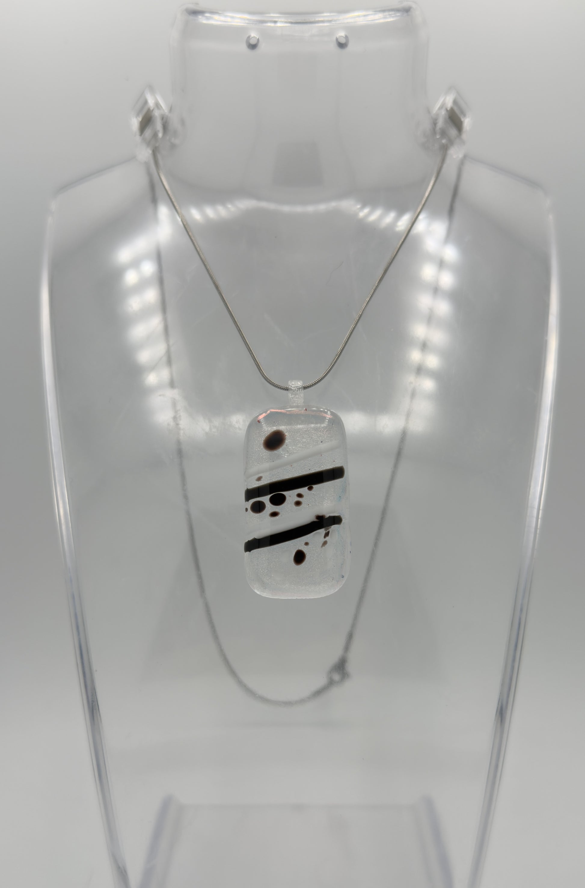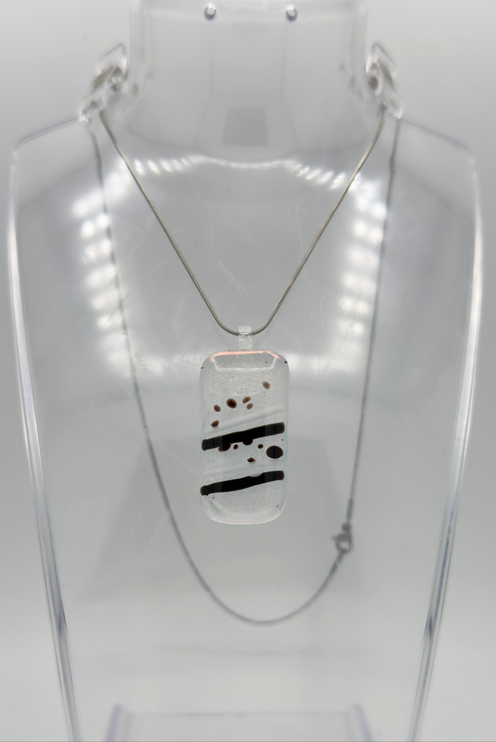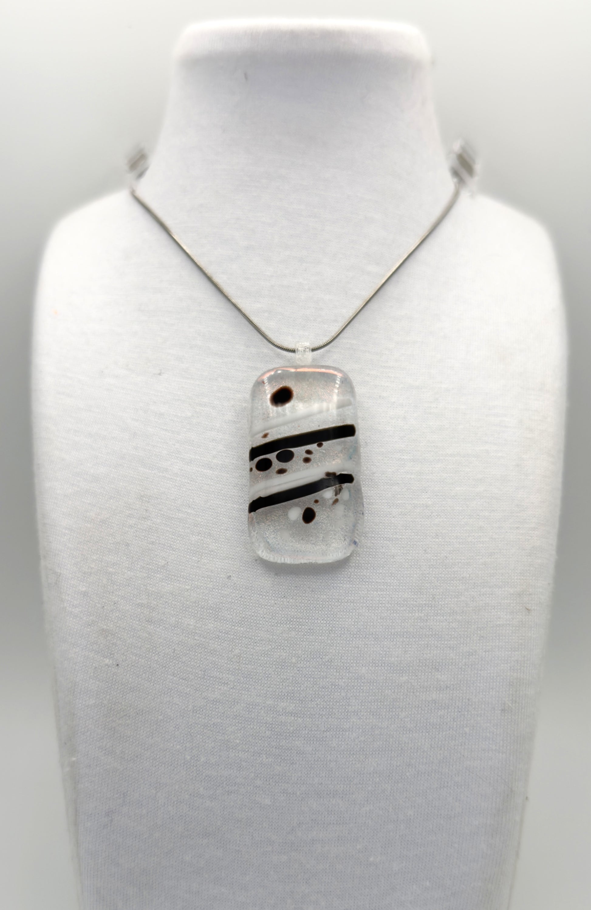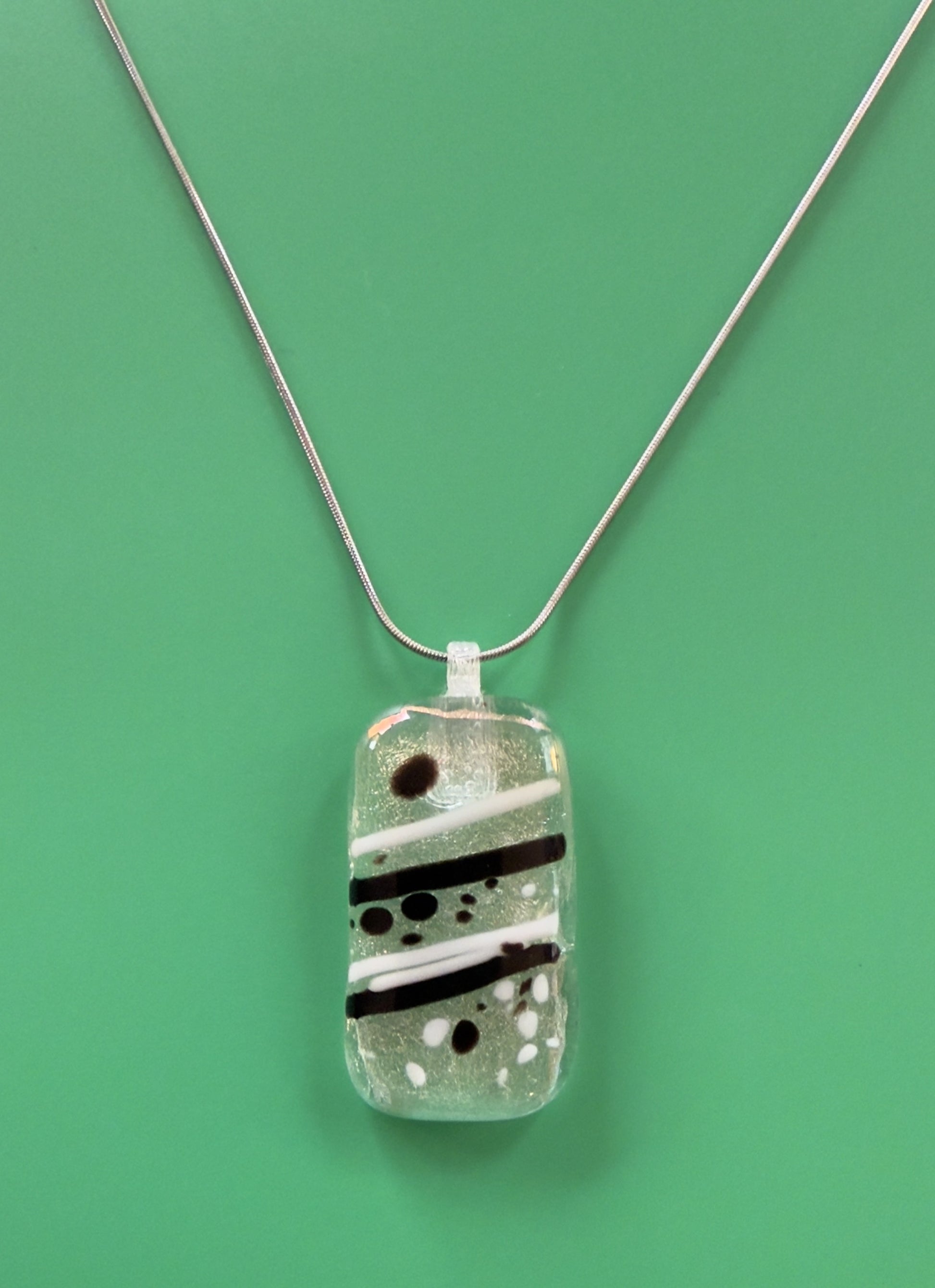 3.8cm x 1.7cm Antique glass w/ black and white frit and stringers over Rose Gold dichroic glass SS chain