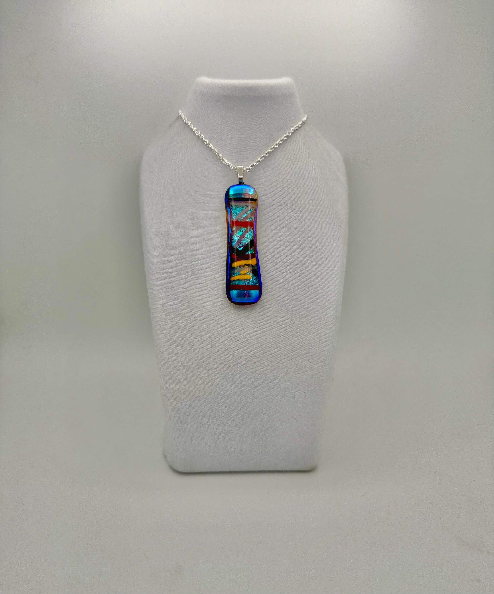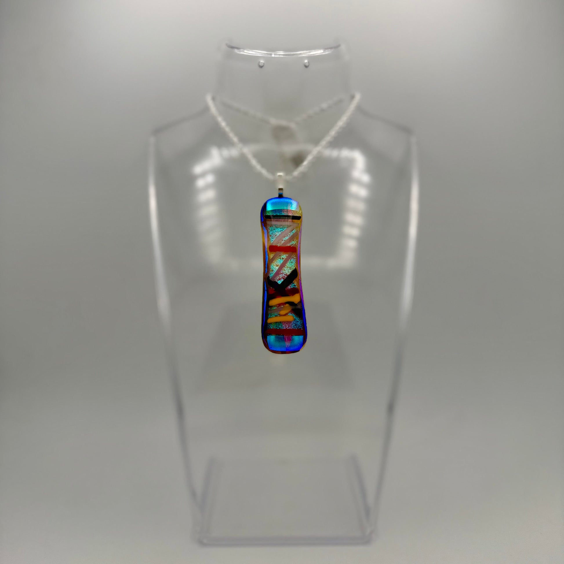 Clear Amber Antique hand blown art glass over Teal Pink dichroic glass with yellow, red, black, maroon and firelight stringers with 3mm silver chain.