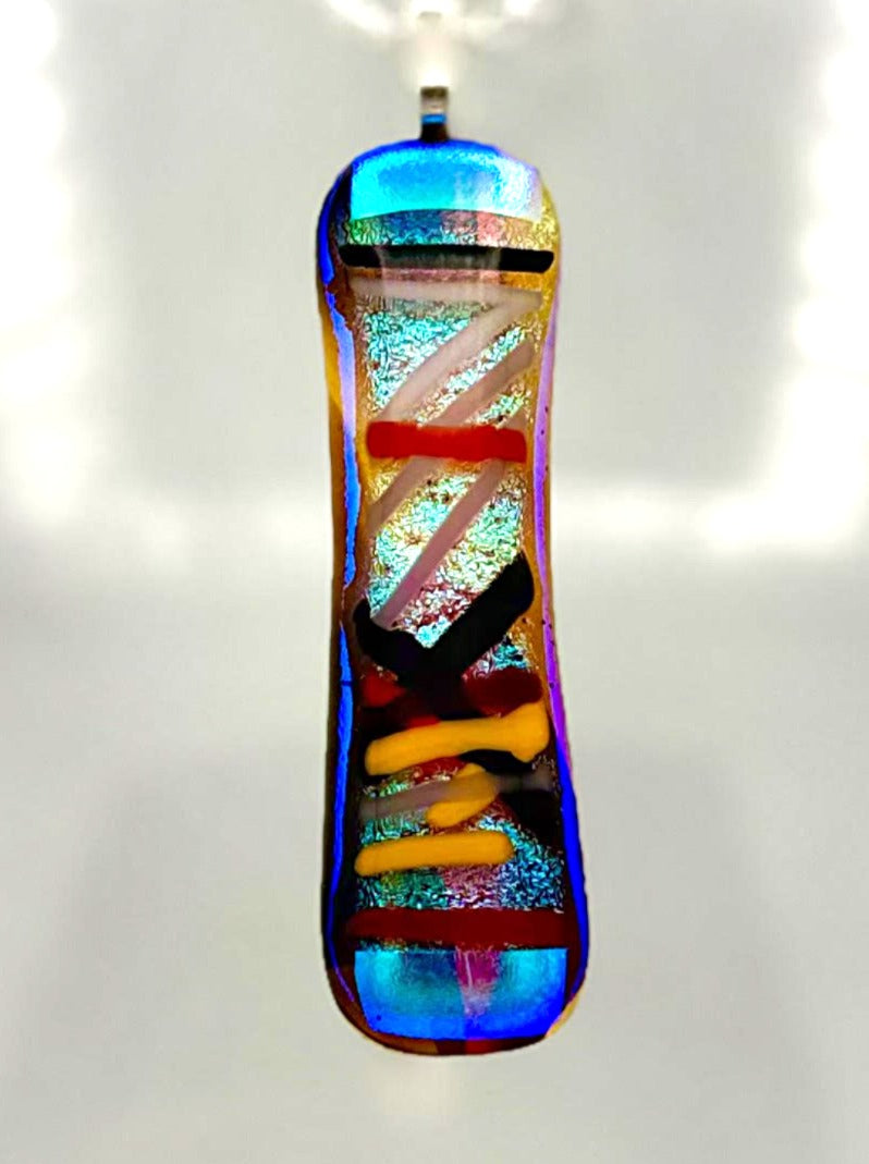 This fused glass jewelry pendant is a luminous collaboration between father and son artists Sam and Dennis Weddle, handcrafted in their Chelan Stained Glass studio in Wenatchee, Washington. Each piece begins with a base of antique, hand-blown sheet glass—centuries-old craftsmanship reborn through modern kiln-fusing techniques. Layers of brilliant dichroic glass are carefully added, capturing shifting colors that shimmer from every angle. Fired to perfection, the result is a pendant that blends history, artistry, and light into one elegant statement piece. Every contour and hue reflects the Weddle's shared vision: preserving traditional glassmaking while infusing it with contemporary expression. No two pieces are ever alike—each pendant carries its own soul of color and reflection, echoing the timeless bond between generations of artists and the enduring beauty of glass transformed by fire. Handmade entirely in Wenatchee, this pendant embodies craftsmanship, heritage, and a deep love for the art of glass