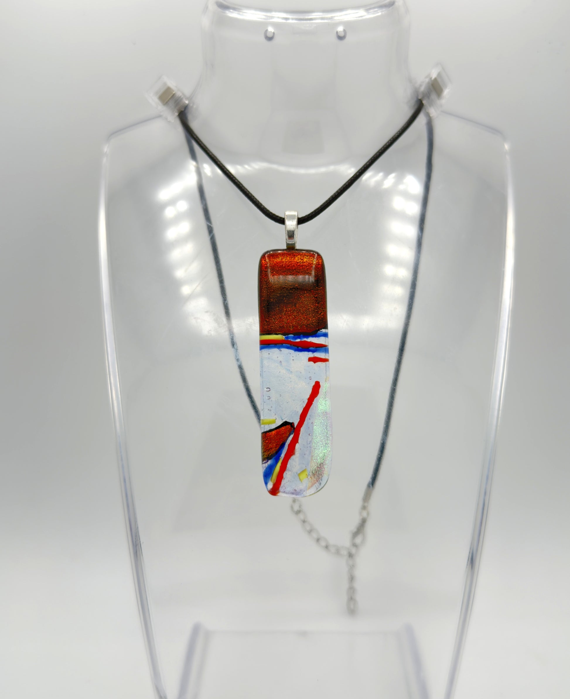This Piece is Clear with blue, yellow and red stringers, plus with red dichroic glass chips and a Black cord. This fused glass jewelry pendant is a radiant creation handcrafted by father and son artists Sam and Dennis Weddle in their Chelan Stained Glass studio in Wenatchee, Washington. Built upon a foundation of high-quality Spectrum sheet glass, each pendant features layers of luminous dichroic glass, fused with carefully selected frits and hand-placed elements that capture and reflect light in dazzling ways. During the kiln-firing process, the glass melts and flows together, creating organic textures, color gradients, and intricate patterns unique to every piece. The result is a pendant that feels alive with color and motion—changing hues as it moves in the light. Every pendant embodies both precision and artistry, combining time-honored glasswork with modern design sensibilities. No two are ever alike. Each one carries the creative spirit of collaboration, the legacy of fine craftsmanship, and the natural beauty of light transformed through fire and imagination