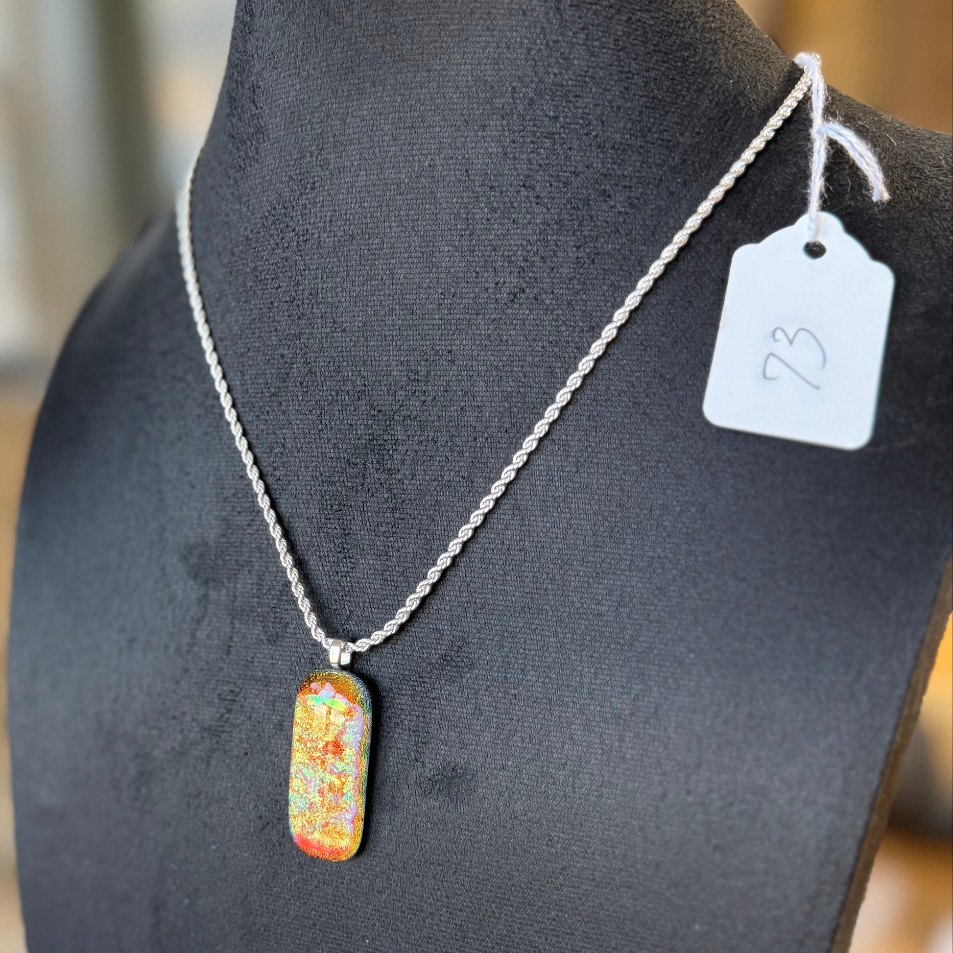 This fused glass jewelry pendant is a radiant creation handcrafted by father and son artists Sam and Dennis Weddle in their Chelan Stained Glass studio in Wenatchee, Washington. Built upon a foundation of high-quality Spectrum sheet glass, each pendant features layers of glass, fused with carefully selected frits and hand-placed elements and a layer of blue/gold dichroic glass that capture and reflect light in dazzling ways. During the kiln-firing process, the glass melts and flows together, creating organic textures, color gradients, and intricate patterns unique to every piece. The result is a pendant that feels alive with color and motion—changing hues as it moves in the light. Every pendant embodies both precision and artistry, combining time-honored glasswork with modern design sensibilities. No two are ever alike. Each one carries the creative spirit of collaboration, the legacy of fine craftsmanship, and the natural beauty of light transformed through fire and imagination