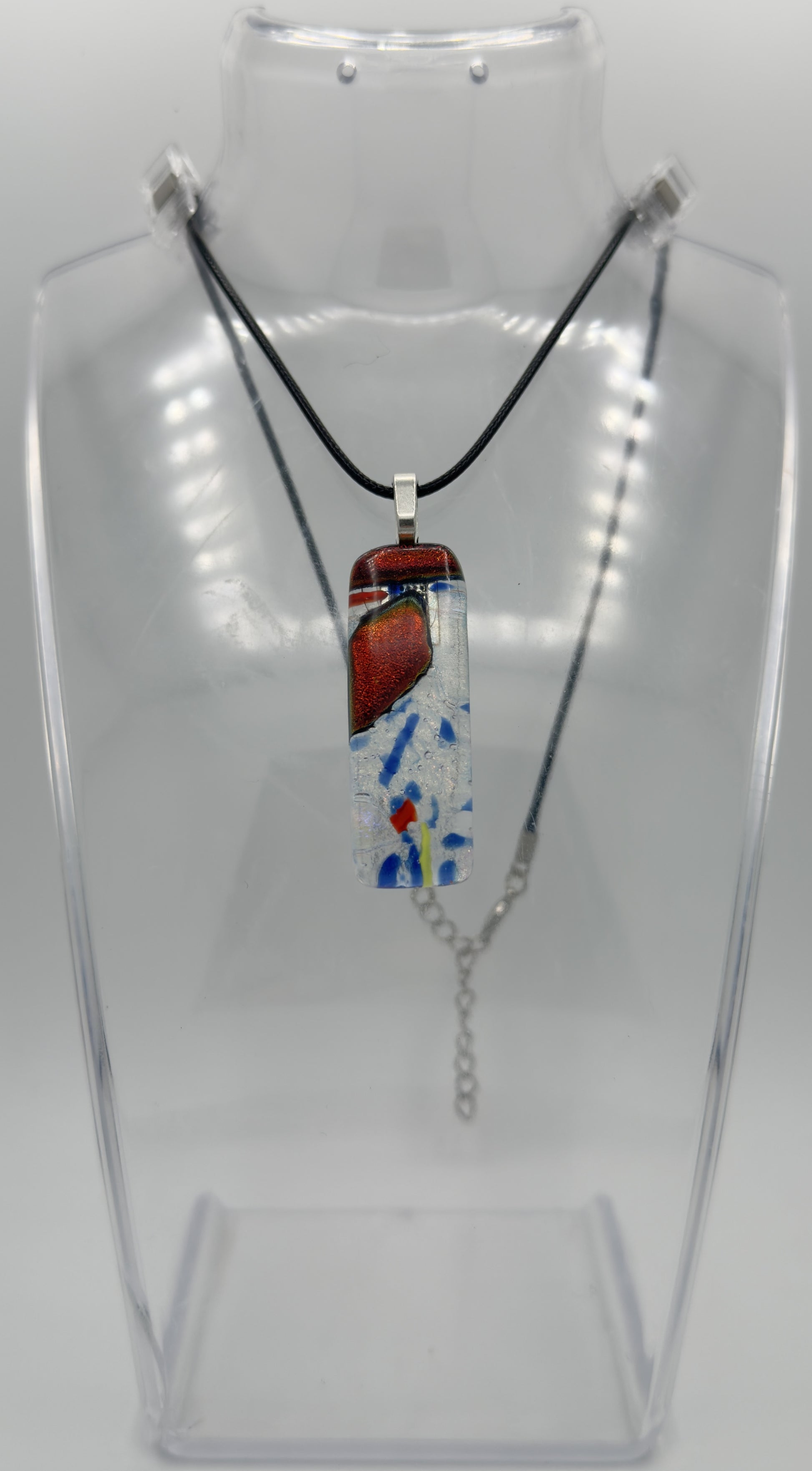 4.7cm x 1,7cm multi colored dichroic glass w/ red yellow blue frit and stringers Has Candy Apple Red dichroic glass chips. This fused glass jewelry pendant is a radiant creation handcrafted by father and son artists Sam and Dennis Weddle in their Chelan Stained Glass studio in Wenatchee, Washington. Built upon a foundation of high-quality Spectrum sheet glass, each pendant features layers of luminous dichroic glass, fused with carefully selected frits and hand-placed elements that capture and reflect light in dazzling ways. During the kiln-firing process, the glass melts and flows together, creating organic textures, color gradients, and intricate patterns unique to every piece. The result is a pendant that feels alive with color and motion—changing hues as it moves in the light. Every pendant embodies both precision and artistry, combining time-honored glasswork with modern design sensibilities. No two are ever alike. Each one carries the creative spirit of collaboration, the legacy of fine craftsmanship, and the