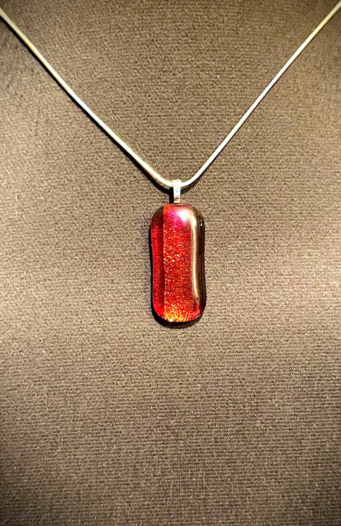 Strawberry Red & Purple antique glass over gold dichroic glass. It's 3.5cm x 1.5cm with silver chain. This fused glass jewelry pendant is a radiant creation handcrafted by father and son artists Sam and Dennis Weddle in their Chelan Stained Glass studio in Wenatchee, Washington. Built upon a foundation of high-quality Spectrum sheet glass, each pendant features layers of luminous dichroic glass, fused with carefully selected frits and hand-placed elements that capture and reflect light in dazzling ways. During the kiln-firing process, the glass melts and flows together, creating organic textures, color gradients, and intricate patterns unique to every piece. The result is a pendant that feels alive with color and motion—changing hues as it moves in the light. Every pendant embodies both precision and artistry, combining time-honored glasswork with modern design sensibilities. No two are ever alike. Each one carries the creative spirit of collaboration, the legacy of fine craftsmanship, and the