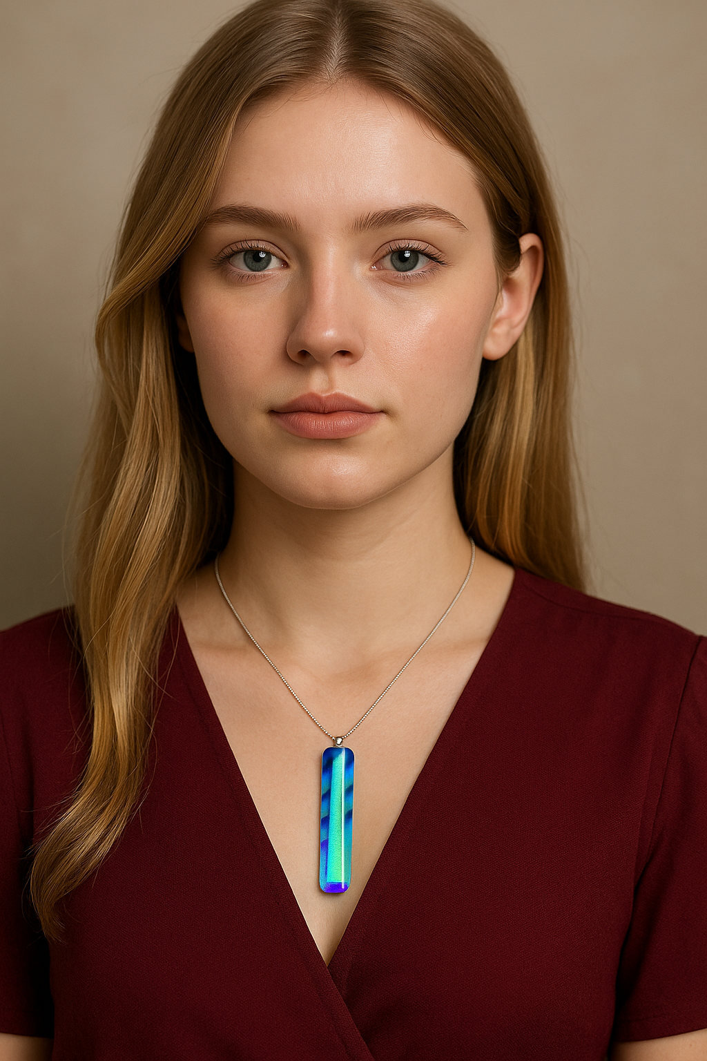 Gold Pink Teal Dichroic glass over clear, blue, white Spectrum glass and Silver Chain. This fused glass jewelry pendant is a radiant creation handcrafted by father and son artists Sam and Dennis Weddle in their Chelan Stained Glass studio in Wenatchee, Washington. Built upon a foundation of high-quality Spectrum sheet glass, each pendant features layers of luminous dichroic glass, fused with carefully selected frits and hand-placed elements that capture and reflect light in dazzling ways. During the kiln-firing process, the glass melts and flows together, creating organic textures, color gradients, and intricate patterns unique to every piece. The result is a pendant that feels alive with color and motion—changing hues as it moves in the light. Every pendant embodies both precision and artistry, combining time-honored glasswork with modern design sensibilities. No two are ever alike. Each one carries the creative spirit of collaboration, the legacy of fine craftsmanship, and the natural beauty of light transformed through fire and imagination