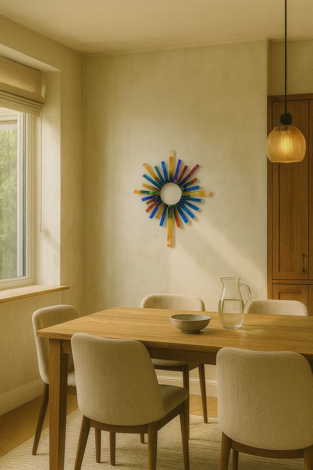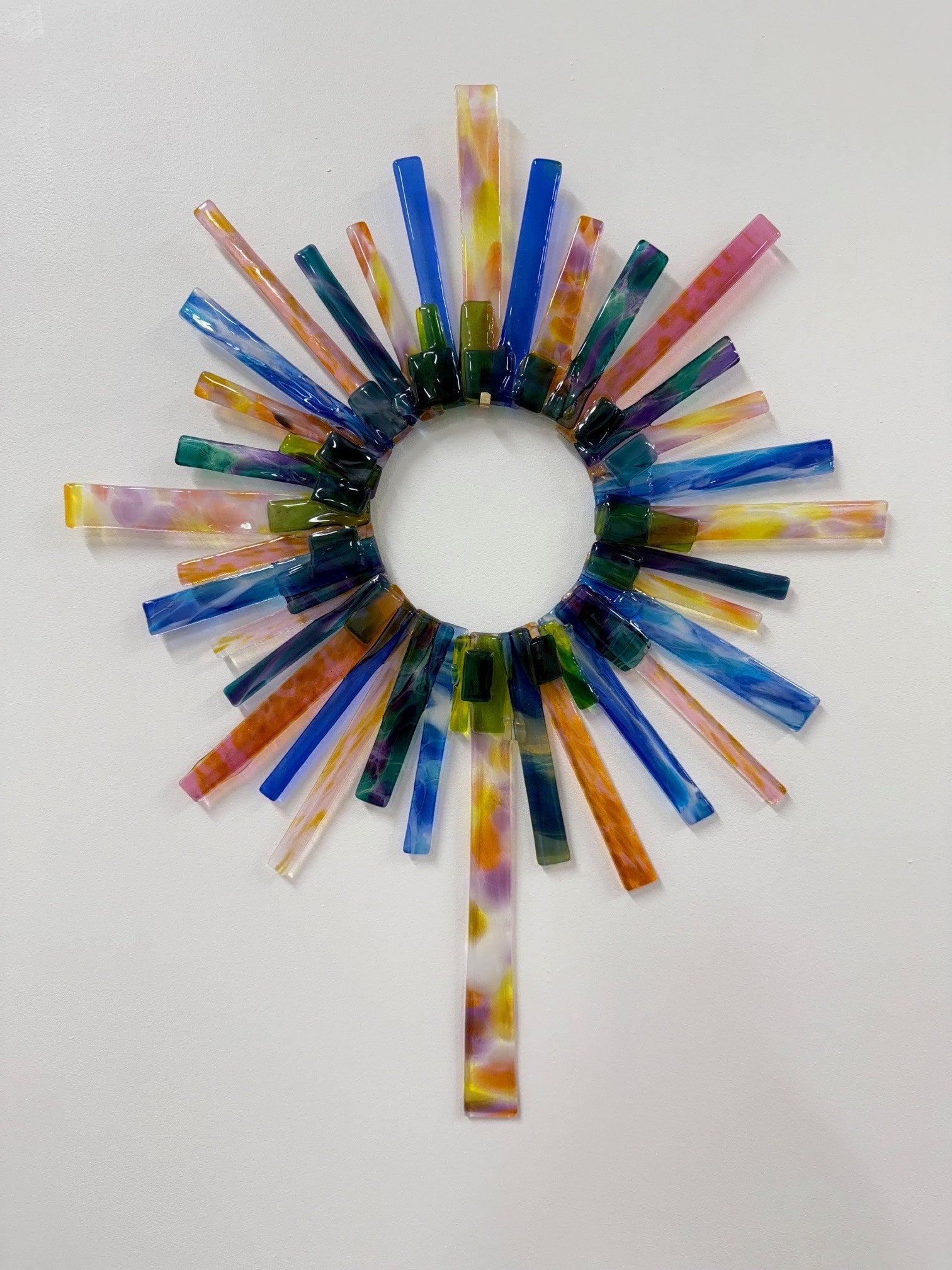 Measuring 21” x 18 ½”, this handmade fused glass piece was crafted in Wenatchee, Washington, with hand-blown antique sheet glass. The design bursts outward from a circular center, with glass strips radiating like beams of light. Rich cobalt blues, fiery ambers, emerald greens, and hints of rose create a stunning color balance. Each beam is uniquely textured, catching and reflecting light in ways that change throughout the day. Perfect as a statement art piece, this work blends traditional glassmaking with contemporary design, adding a vibrant and artistic presence to any room or collection.