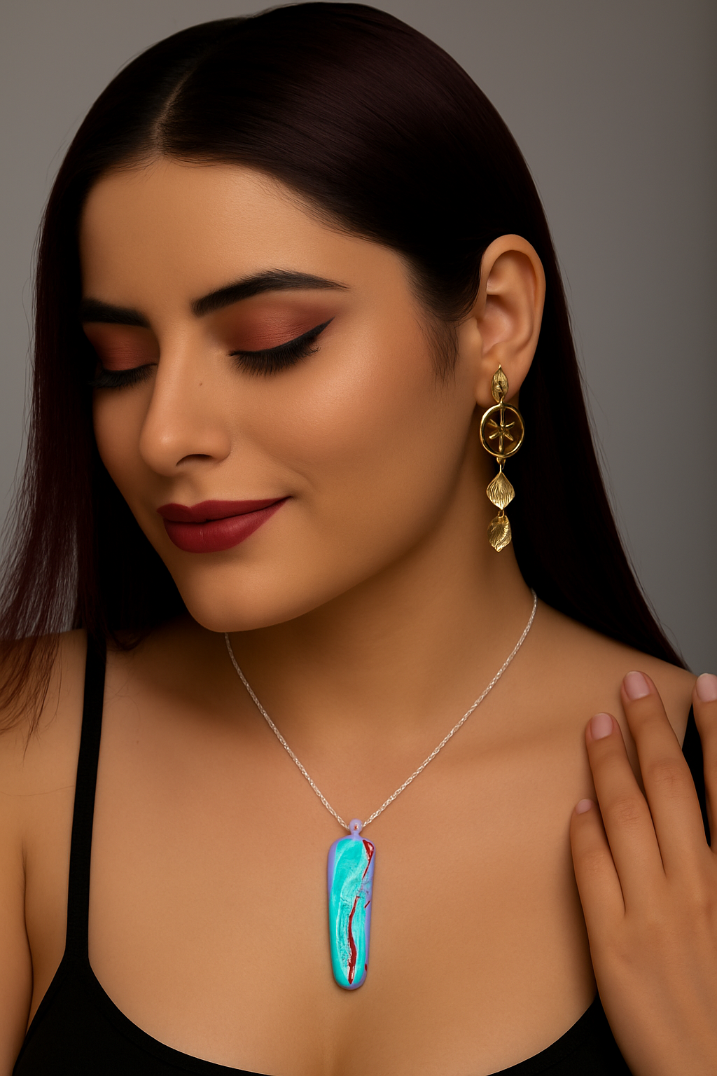 This fused glass jewelry pendant is a luminous collaboration between father and son artists Sam and Dennis Weddle, handcrafted in their Chelan Stained Glass studio in Wenatchee, Washington. Each piece begins with a base of antique, hand-blown sheet glass—centuries-old craftsmanship reborn through modern kiln-fusing techniques. Layers of brilliant dichroic glass are carefully added, capturing shifting colors that shimmer from every angle. Fired to perfection, the result is a pendant that blends history, artistry, and light into one elegant statement piece. Every contour and hue reflects the Weddle's shared vision: preserving traditional glassmaking while infusing it with contemporary expression. No two pieces are ever alike—each pendant carries its own soul of color and reflection, echoing the timeless bond between generations of artists and the enduring beauty of glass transformed by fire. Handmade entirely in Wenatchee, this pendant embodies craftsmanship, heritage, and a deep love for the art of glass