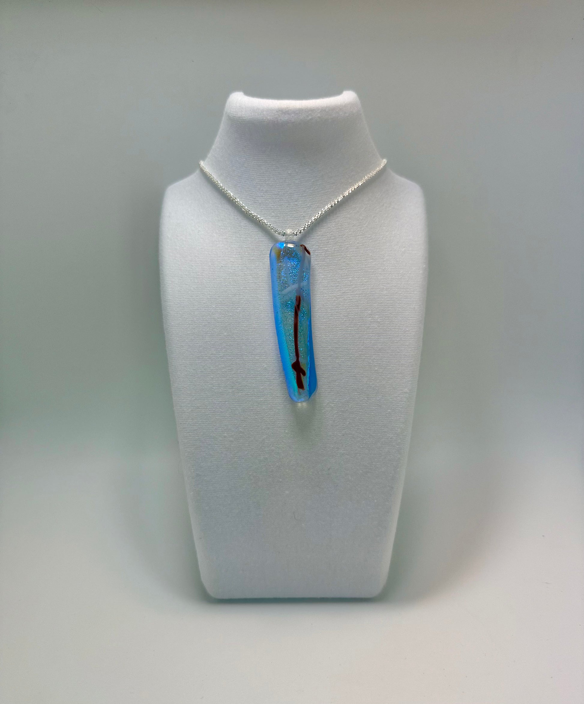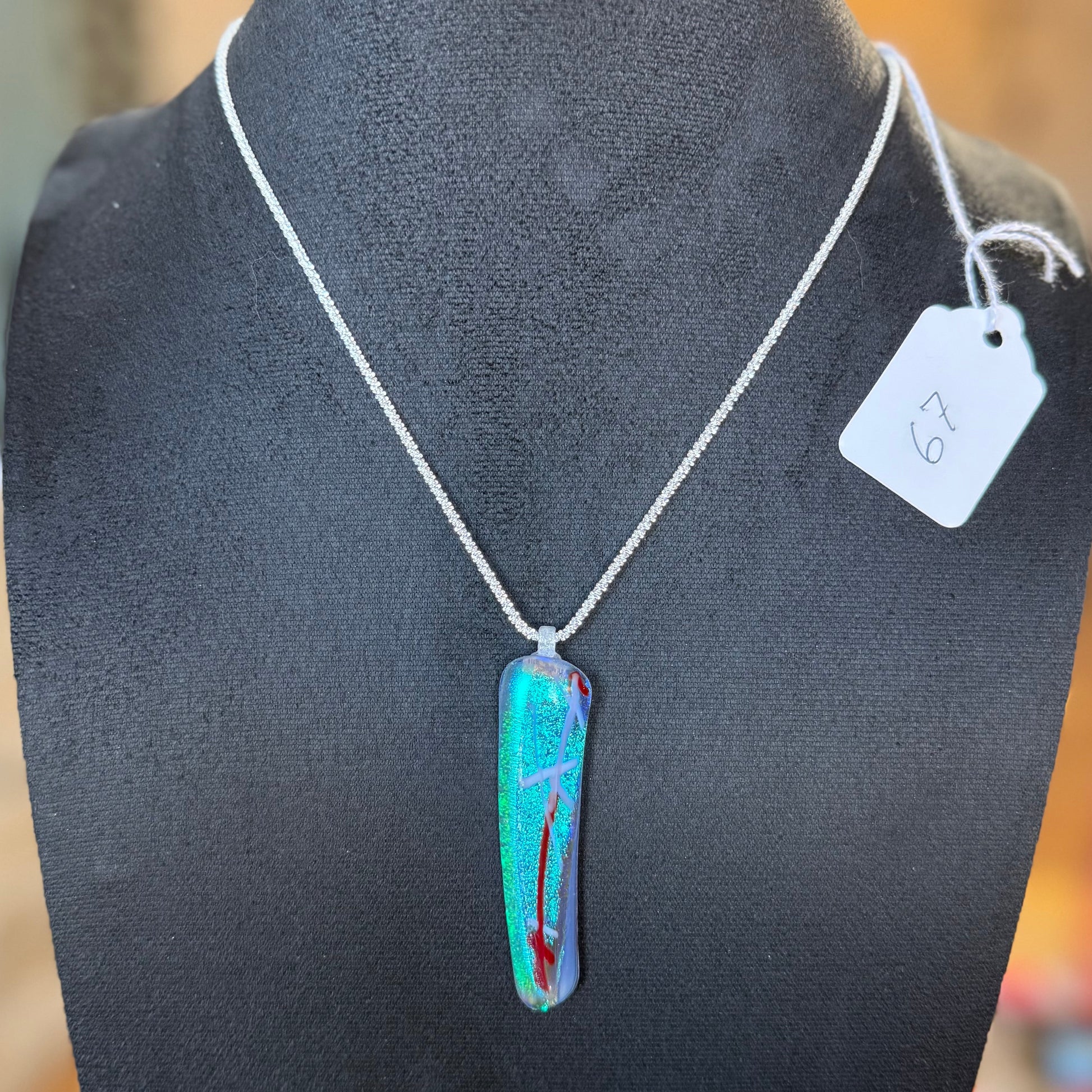 Pale Blue Clear Antique glass pendant with Teal Dichroic and Firelight and Maroon Stringers. Abstract Shape and Design with a Japanese feel. Size 6.5cm x 1.8cm with Silver Chain.