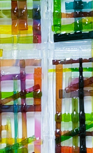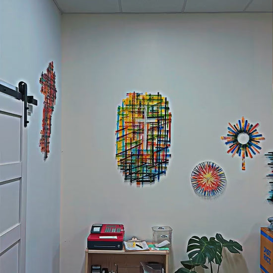 This one-of-a-kind multicolored fused glass art piece is a radiant expression of faith and light. Measuring 37 inches tall and 22 inches wide, it features a luminous clear glass cross at its center—symbolizing the pure and eternal light of Christ. Surrounding the cross is an array of vibrant, hand-cut strips of antique, hand-blown sheet glass, each carefully selected for its depth, texture, and brilliance. The spectrum of colors radiates outward in harmony, representing the divine beauty and grace that flows from Christ into the world. Every piece of glass has been freehand cut to create an organic, fluid composition that feels alive with spiritual energy and motion. Light interacts dynamically with the varying hues and textures, transforming throughout the day as it reflects and refracts across the surface. The result is a breathtaking visual experience—a modern yet timeless work of art that evokes peace, hope, and renewal. This unique glass wall art is not just a decorative piece, but a meaningful statement of faith, craftsmanship, and the beauty of divine light made tangible through artistry