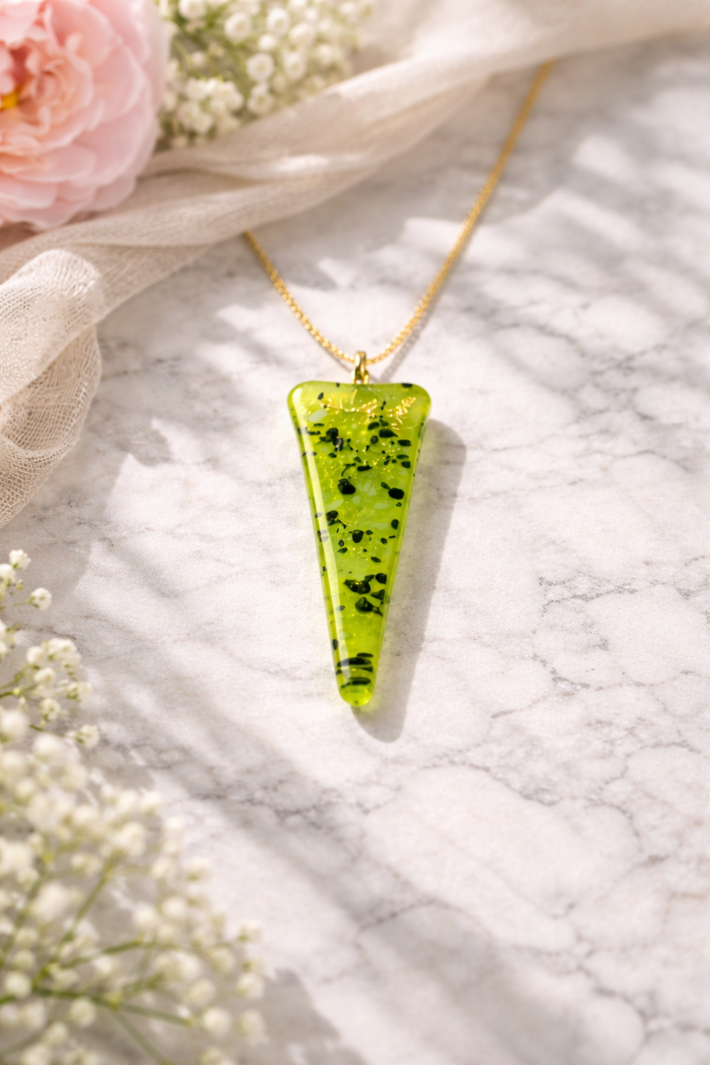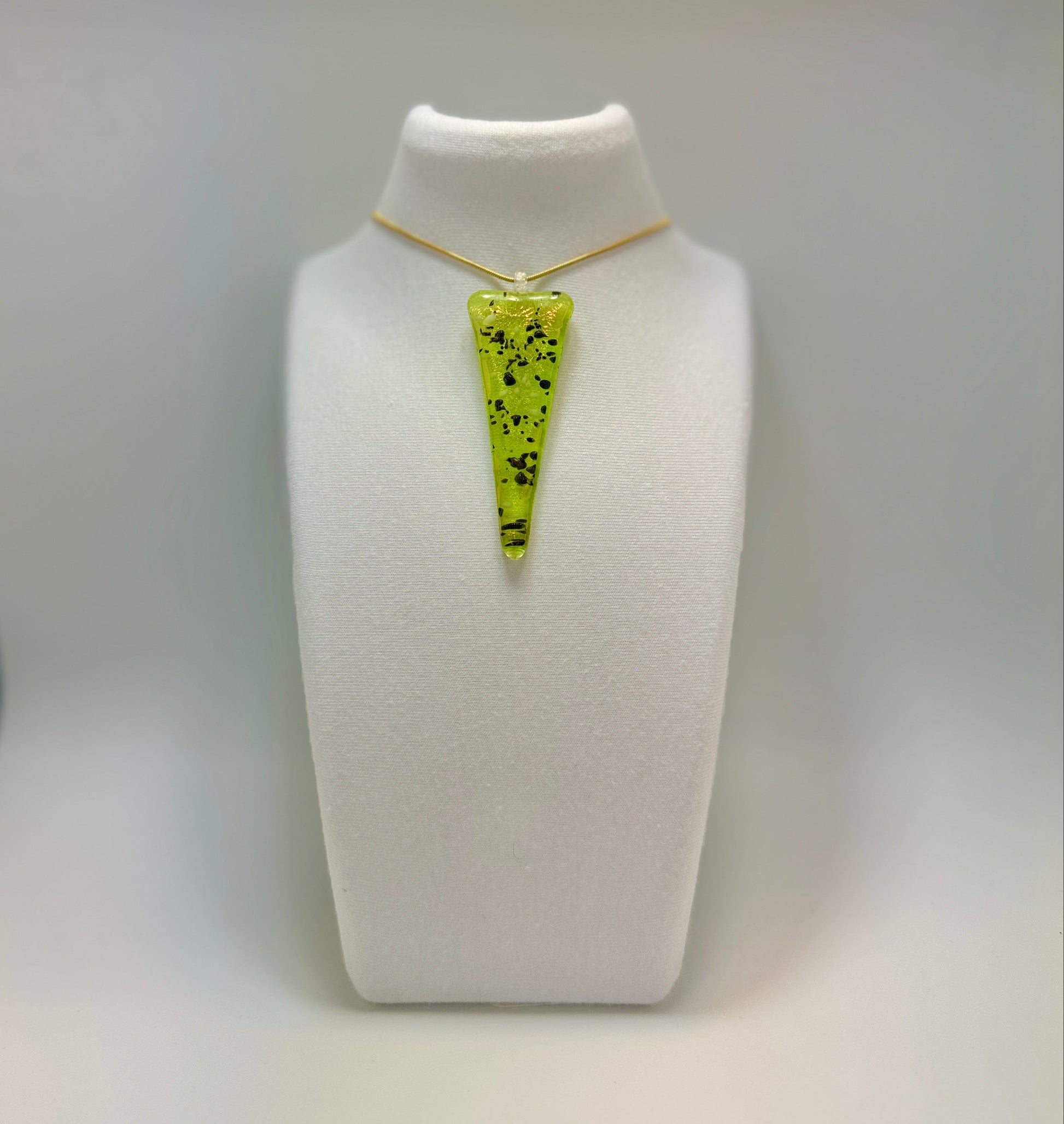 Light Green Translucent Antique art glass with Black and Firelight frit Fused over Rose Gold Dichroic Glass Pendant. Size 6cm x 2.5cm on Gold Colored Chain.