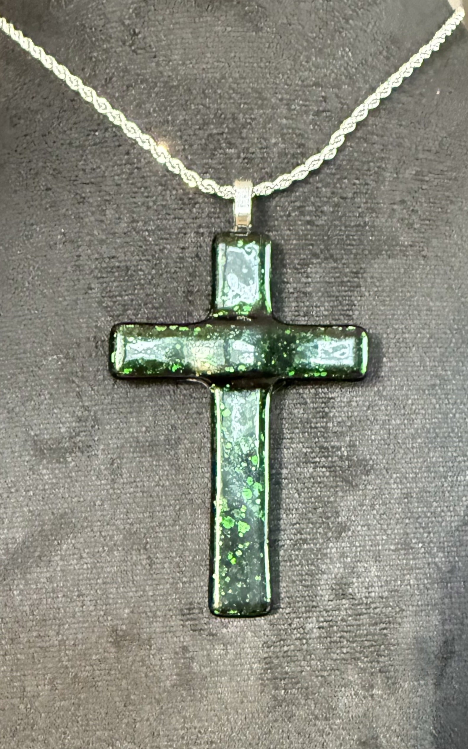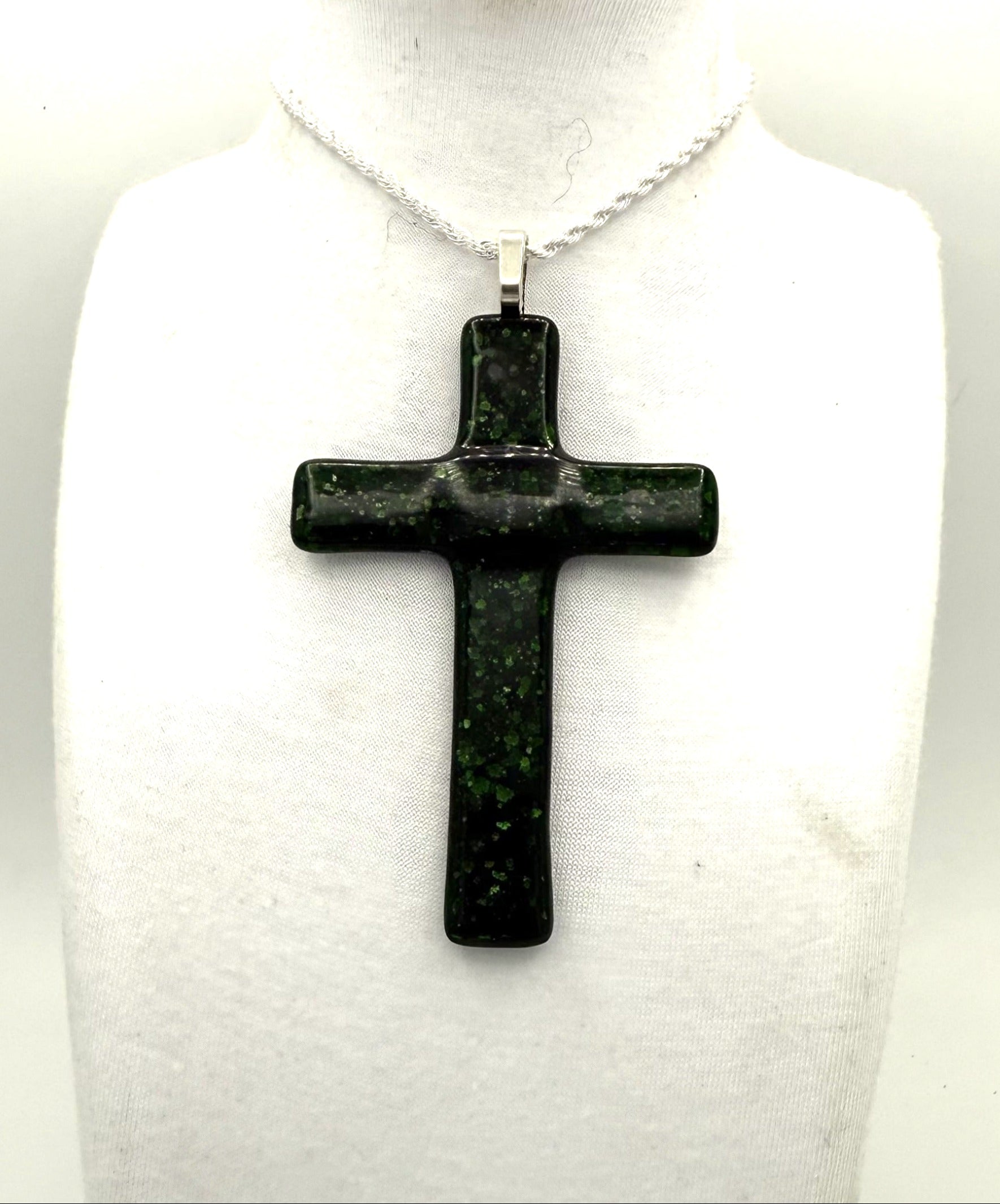 Dark Green Spectrum fused glass Cross with metal flake 3 by 2 inches. has silver chain