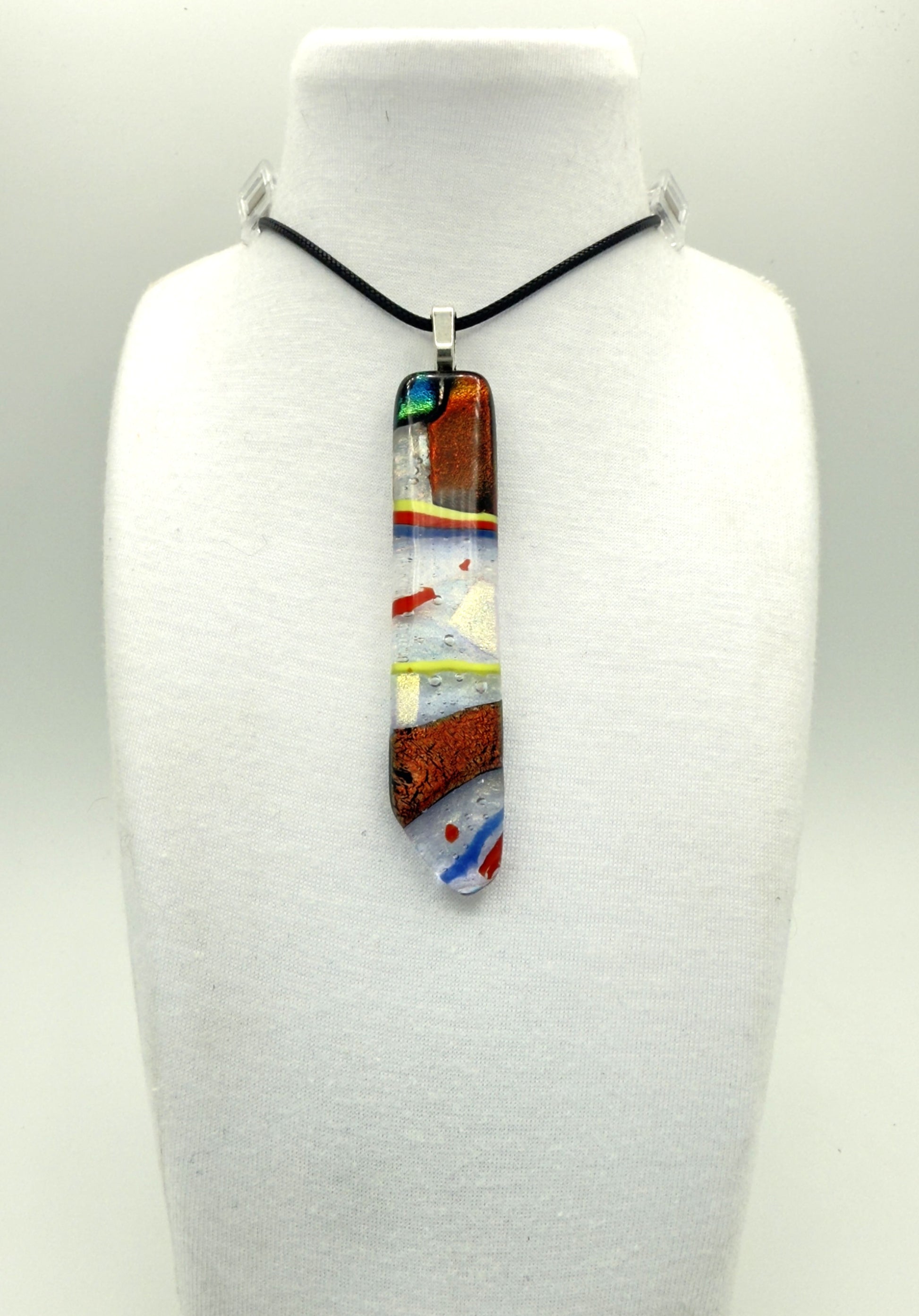This Piece is Clear with blue, yellow and red stringers, plus with red dichroic glass chips and a Black cord. This fused glass jewelry pendant is a radiant creation handcrafted by father and son artists Sam and Dennis Weddle in their Chelan Stained Glass studio in Wenatchee, Washington. Built upon a foundation of high-quality Spectrum sheet glass, each pendant features layers of luminous dichroic glass, fused with carefully selected frits and hand-placed elements that capture and reflect light in dazzling ways. During the kiln-firing process, the glass melts and flows together, creating organic textures, color gradients, and intricate patterns unique to every piece. The result is a pendant that feels alive with color and motion—changing hues as it moves in the light. Every pendant embodies both precision and artistry, combining time-honored glasswork with modern design sensibilities. No two are ever alike. Each one carries the creative spirit of collaboration, the legacy of fine craftsmanship, and the natural beauty of light transformed through fire and imagination